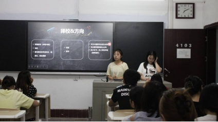 4103教室的滕杨和向子燕从院校选择、考研经验及心态调整三方面分享。她们强调院校选择要结合自身实力与兴趣,利用研招网等渠道了解信息,备考规划上根据个人实际准备英语等科目,尤其要以单词背诵贯穿备考阶段,还推荐了网课学习渠道。在心态调适方面,她们建议不盲目与他人比进度,适度放松保持身心愉悦。分享会尾声,她们激励同学们,“慢慢来就是比较快,不到最后不放弃”。