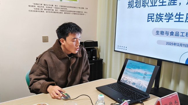活动由罗祖毅老师主持,他明确活动旨在引导学生树立科学职业观、提升规划能力,同时深化民族团结。随后师生共同观看“万人说新疆”系列视频,感悟职业坚守价值。21届毕业生阿曼古丽分享新疆基础教育就业情况及提升能力的建议;25级研究生滕杨围绕个人情况、目标定位等方面分享考研经验,强调“选择大于努力”并给出作息规划建议。