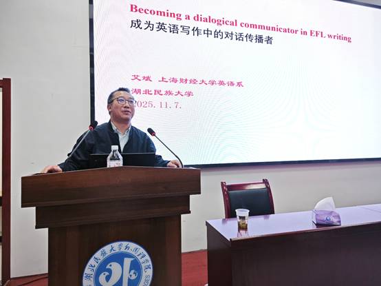 艾斌教授为澳大利亚迪肯大学哲学博士、对外经济贸易大学应用经济学博士后,在应用语言学、社会语言学及跨文化研究领域具有深厚积累。讲座中,他从身份定位、写作难点、跨文化思维与选题方法四个层面系统阐释英语写作的教学理念与实践路径。
