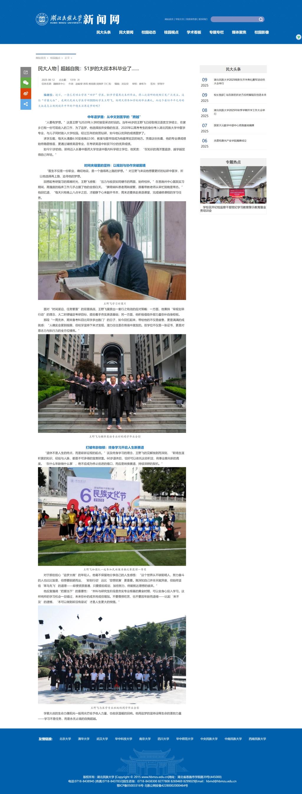 3月13日,2025年度湖北高校新闻奖评选结果揭晓,湖北民族大学25件新闻作品获奖。其中一等奖5件,二等奖7件,三等奖13件,获奖作品涵盖文字消息、文字评论、通讯与深度报道、版面和页(界)面设计、副刊、新闻摄影、新闻视频、融合创新、新闻标题等九个类别,获奖数量位居全省高校前列。