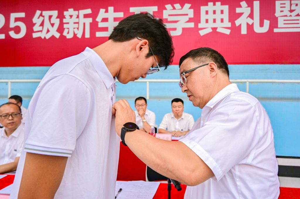 顿祖义为新生代表佩戴湖北民族大学校徽