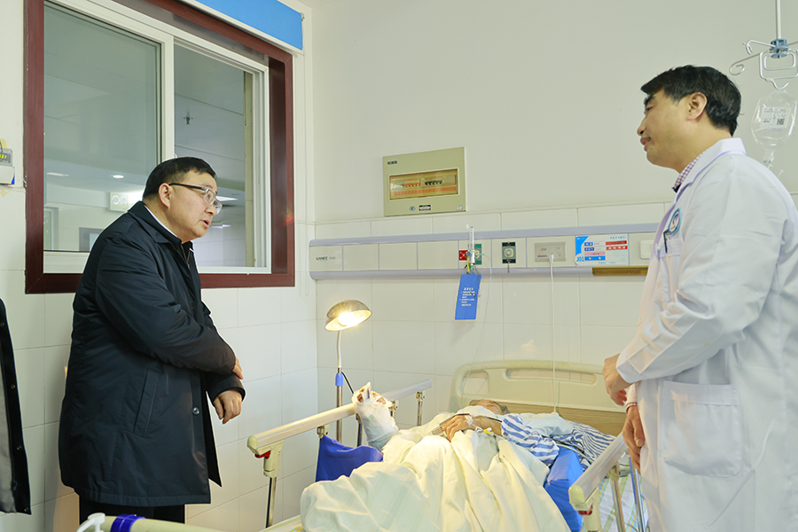 戴清堂还走进附属民大医院看望慰问一线医护人员。在神经内科,他亲切慰问二病区主任陈娟等值班人员,并向坚守在医疗救治一线的医护人员致以崇高敬意,感谢大家用责任和担当守护人民群众的生命健康。在手足外科病房,他与住院患者家属亲切交谈,仔细询问治疗情况和康复进展,并祝愿他们早日康复、阖家幸福。