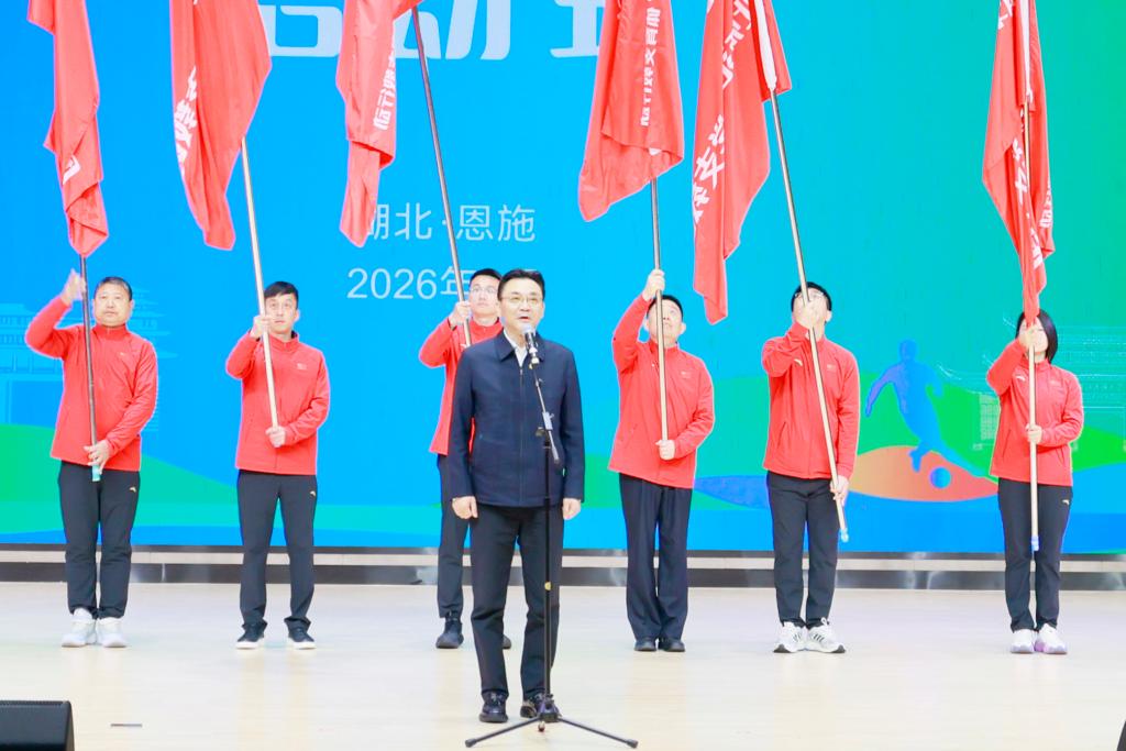 3月31日,2026年体育支教志愿服务工作调研暨湖北省“千师百校”体育支教行动启动式在湖北民族大学举行。湖北省体育局党组书记、局长水兵宣布湖北省体育支教行动正式启动。国家体育总局青少司司长李辉,湖北省体育局党组成员、副局长骆启义共同为11支高校体育支教团授旗,标志着2026年体育支教工作全面铺开。