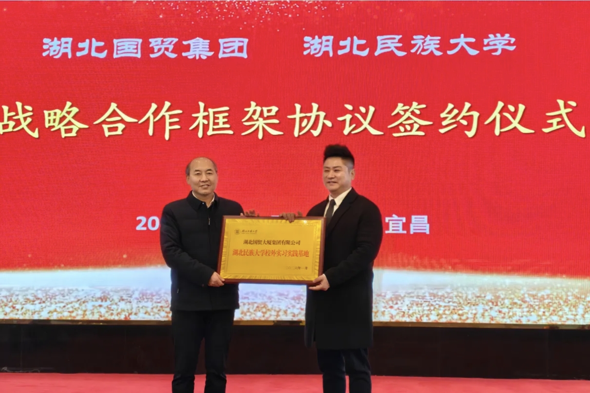 1月26日下午,湖北民族大学与湖北国贸集团战略合作签约暨“湖北民族大学·神武峡(三峡大瀑布)智慧旅游产学研用大数据实践中心”揭牌仪式在宜昌举行。湖北民族大学党委常委、副校长李军与湖北国贸大厦集团有限公司董事长韩靖忠共同为“智慧旅游产学研用大数据实践中心”揭牌。李军与湖北国贸大厦集团有限公司副总经理、三峡晓峰旅游集团总经理安勤代表双方签署了战略合作框架协议,李军向国贸集团授予“湖北民族大学校外实习实...