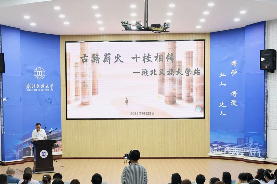 为向师生普及基础古籍保护知识,助力古籍保护融入校园文化,9月29日,由国家图书馆(国家古籍保护中心)、湖北省文化和旅游厅主办,湖北省图书馆(湖北省古籍保护中心)承办,武汉大学等15所高校协办的“古籍薪火十校相传——湖北省古籍保护课程进校园”系列活动走进湖北民族大学。活动启动仪式在学校图书馆学术报告厅举行,国家图书馆研究馆员向辉受邀参加活动并进行专题讲座。湖北民族大学图书馆领导及学校相关院系师生代表25...