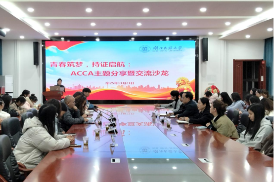 本网讯(见习记者 佘思咏 彭如妍 刘晨怡 记者 苏燕康/文 记者 周颀涵 见习记者 文秀娟/摄)2025年11月21日,经济与管理学院ACCA主题分享暨交流沙龙活动在经管楼附303会议室举行。启瑞集团首席财务官万金成,ACCA市场拓展经理郭姝、ACCA市场拓展主任胡姚瑶,高顿教育教师代表张颖洁、谢晖、胡伊宁,经济与管理学院党委书记陈霞,副院长冉瑞恩,会计学系副主任张尊应邀出席,ACCA方向班24级、25级学生参与本次活动。经济与管理学院会计学系主任刘洁玫担任主持人。