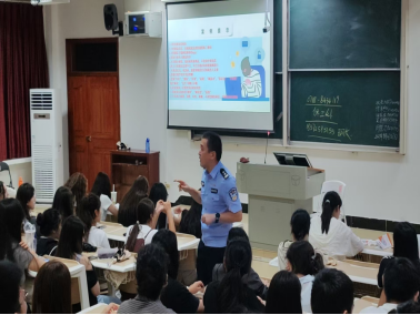 本网讯(通讯员 燕潇 刘雨彤 邓玉权)10月8日晚,我院联合恩施市公安局舞阳坝派出所在德智楼举办2025级新生防诈骗专题讲座,恩施市舞阳坝派出所副所长王烁担任主讲,学院2025级全体新生参加讲座。
