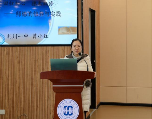 恩施州高中语文教指委委员曾小红以《回归初心 德术双修——师德的修养与实践》为题作报告。报告从文化根脉中的师德智慧、新时代师德的实践路径、师道精神与教育未来三个维度展开,结合生动的教育故事,引导师范生如何在教育教学实践中坚持“仁爱”与“智慧”同行,彰显师德强大的育人力量。
