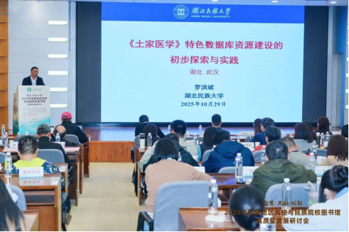 随后,报告重点阐述了我馆《土家医学》特色数据库资源建设的理念和实践路径探索。该数据库以土家医学古籍与口传文献、方剂资源及道地药材图谱为核心资源层,系统构建土家族药理学数据库,推动传统知识的现代整合。在文化传承方面,创新引入富有民族特色的AI智慧馆员,通过模拟土家医学(梯玛)传承人进行药材制备演示与禁忌问答,实现传统医学的活态传播。在科研服务方面,数据库实现与NCBI等平台对接,支持通过PMID直接链接土家医药相关研究论文,显著提升学术利用效率。罗馆长指出,该项目旨在深度融合民族医学资源与现代信息技术,为培养卓越医学人才提供特色化、智慧化的资源服务。报告结束后,与会同仁就土家医学数据库的建设细节与罗馆长进行了交流,并对其在民族医药领域的开拓价值给予了充分认可。