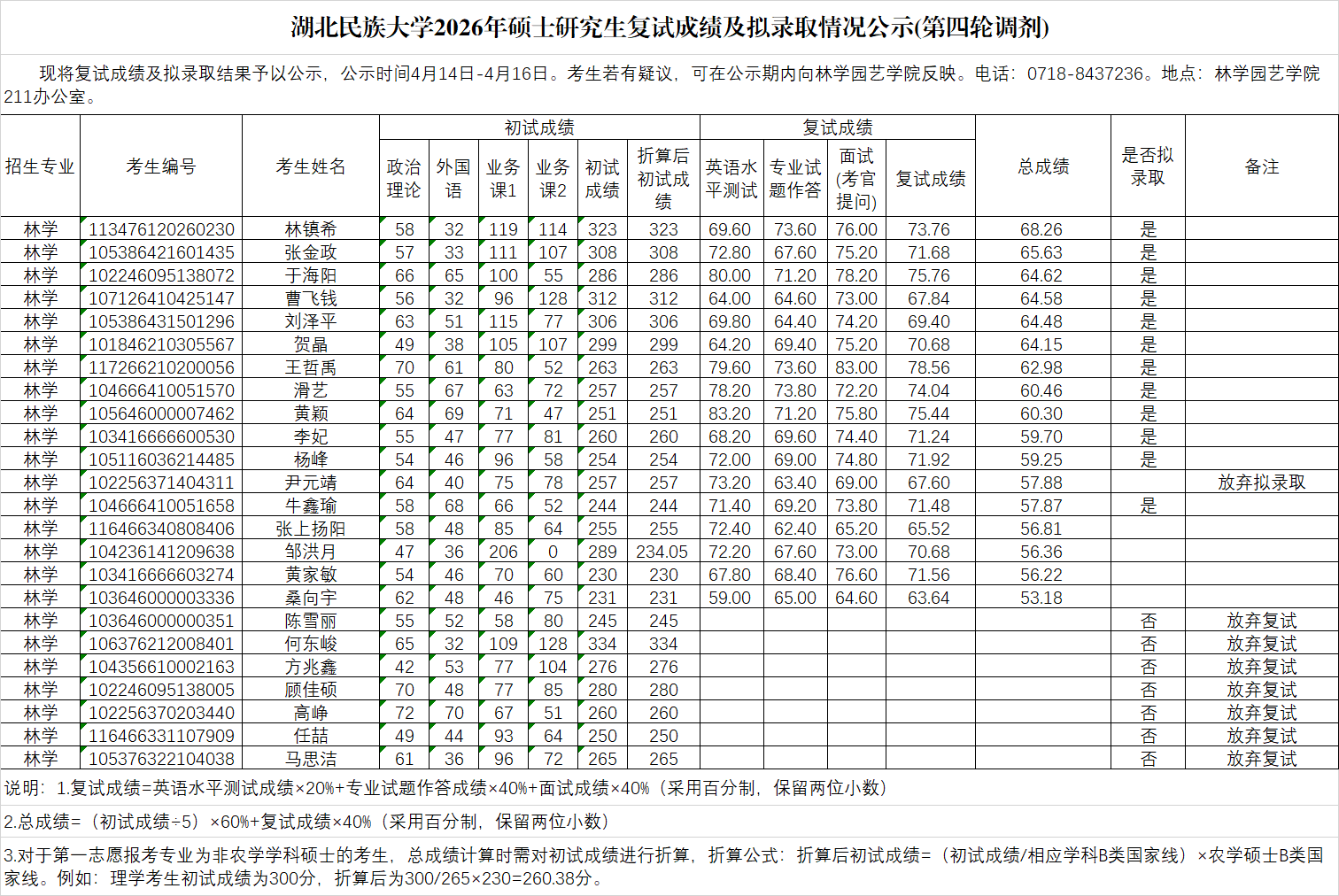 林学园艺学院2026年硕士研究生复试成绩及拟录取情况公示(第四轮调剂)