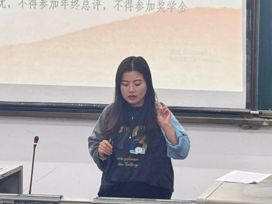 活动中,李子君老师围绕“志愿服务”与“社会实践”两大主题展开讲解。她结合学院实际与优秀学子案例,解读了“第二课堂成绩单”及学生综合测评在学业成绩、科研创新、文体活动、志愿服务等方面的具体指标与要求,指出志愿服务与社会实践既是奖助学金评定的重要依据,更是大学生成长成才的关键环节。她特别强调社会实践作为大一、大二阶段的必修内容,与综合测评、学分认定、评优评奖紧密相关,并通过往年调研、支教、竞赛等案例,引导新生在实践中锻炼能力、提升素质,实现知行合一与全面发展。现场新生们认真聆听、积极记录。