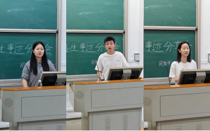 (本网讯 张宝悦 田千册/文 廖舰航 杨晨熙/图))6月15日晚,我院于修远楼5B104、5B105、5B109教室举办“同心圆”优秀毕业生事迹报告会。来自16210402支部的段明丹、熊薪科、刘美琳作为优秀毕业生受“同心圆”人力资源提升项目邀请,向学弟学妹们分享宝贵经验。本次活动在不同时段于多个会场巡回开展,覆盖大一至大三全体学生,现场氛围热烈,反响良好。