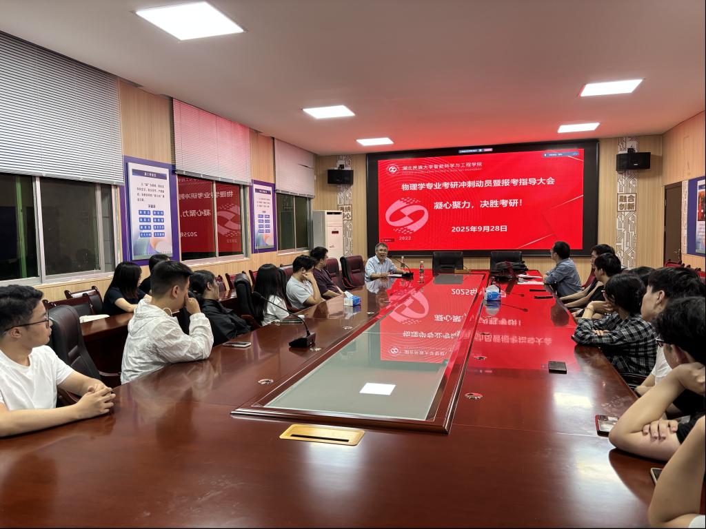 为鼓舞考研学子士气,提供科学备考指导,助力学生成功“上岸”,2025年9月28日,我院物理学专业在集成楼212会议室召开了考研冲刺动员暨报考指导大会。物理系党支部书记蒋冰峰教授、研究生办公室负责人艾青主任出席会议,全体备战考研的毕业生参会。会议由专业负责人刘显明教授主持。