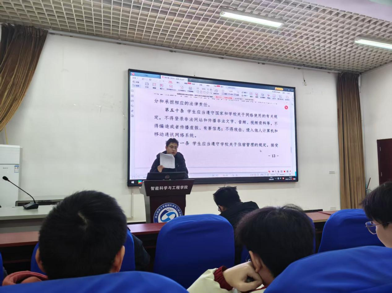为深入落实学校依法治校、从严治校工作要求,压紧压实期末学生管理与安全稳定责任,引导学生树立规则意识、筑牢安全防线,2025年12月18日晚18:30,湖北民族大学智能科学与工程学院在集成楼213学术报告厅召开研究生管理与安全教育专题会议。学院学科办主任陈坤燚系统解读学生管理核心规章制度,研究生辅导员刘宇老师聚焦学期末安全重点工作开展专项警示教育,学院全体研究生参加会议。