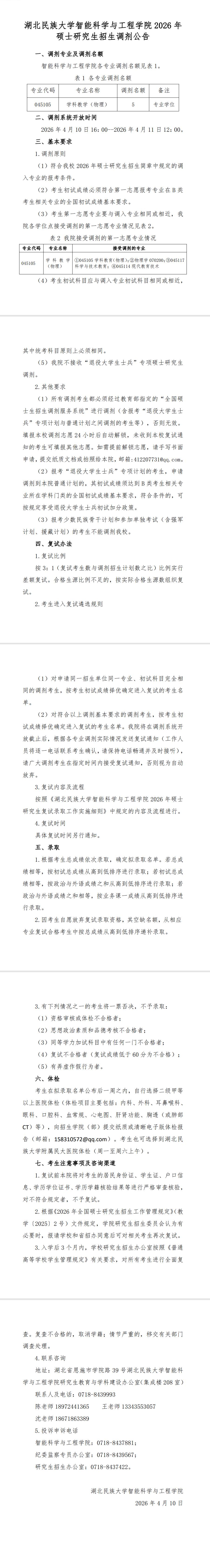 湖北民族大学智能科学与工程学院 2026 年硕士研究生招生调剂公告