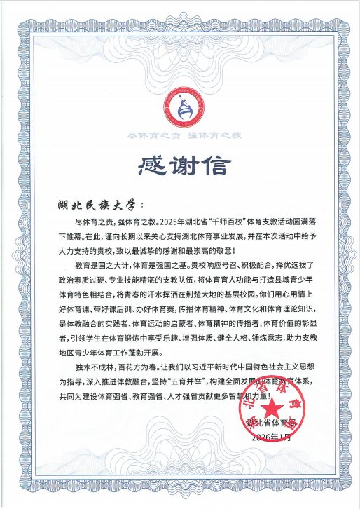 本次“千师百校”行动中,湖北民族大学体育学院积极响应号召,精心选拔优秀师生组建支教团队,聚焦民族地区、偏远山区学校体育发展需求,探索出“民族传统体育进课堂”、“体能训练与兴趣培养相结合”、“体育精神与思政教育相融合”等特色实践路径,有效促进了受援学校体育教学水平提升和校园体育文化建设,工作成效显著,获得受援地区师生及家长一致好评。会上,省体育局对我校在体育支教工作中的突出贡献予以表彰,充分肯定了我校在服务地方体育教育事业、推动体教融合方面的积极作为。