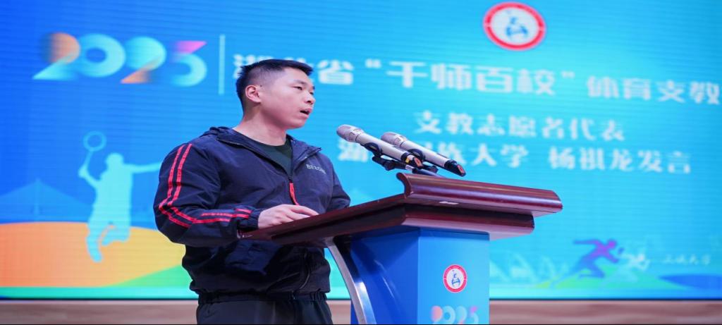 会上,湖北民族大学体育学院学生杨祺龙作为全省唯一志愿者代表发言。他以《让体育之光点亮山区孩子的梦想》为题,深情讲述了我校支教团队深入鄂西民族地区中小学,开展特色体育教学、传承民族传统体育、组织阳光体育活动的经历与感悟。杨祺龙和队友们充分发挥专业特长,将土家族摆手舞、三人板鞋、高脚竞速等民族传统体育项目融入课堂,并针对山区学校器材不足的情况,开发出多类“简易器材体育游戏”,深受学生喜爱,有效激发了基层校园体育活力。他的发言朴实生动、情感真挚,展现了当代体育青年扎根基层、奉献担当的精神风貌,赢得现场热烈掌声。