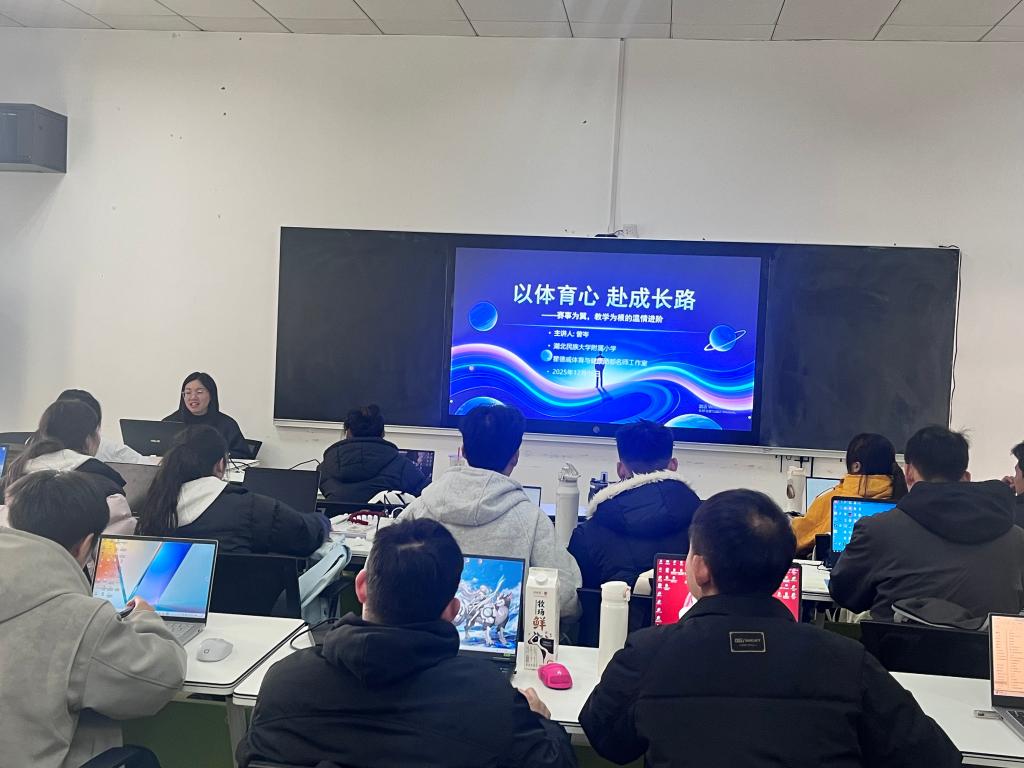 为搭建一线中小学交流平台,助力研究生课程学习与专业实践,2025年12月5日,学院特邀湖北民族大学附属小学曾岑老师开展主题为“以体育心 赴成长路——赛事为翼,教学为根的温情进阶”的专业成长分享会。