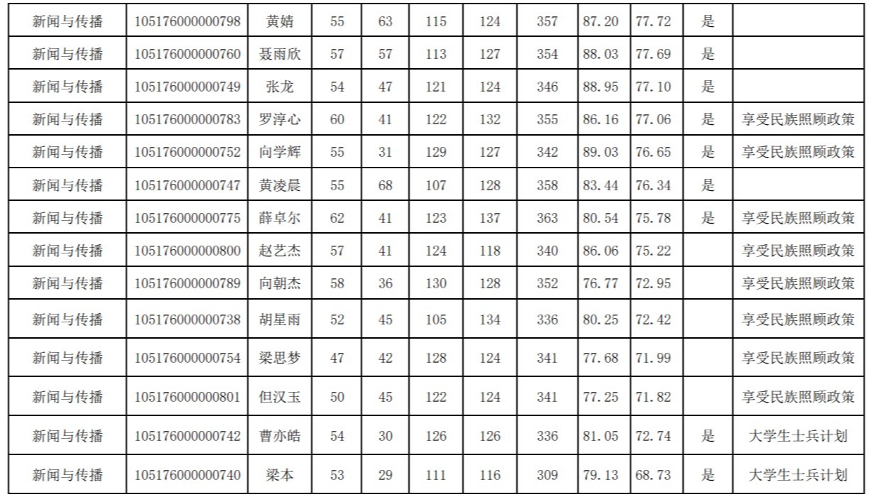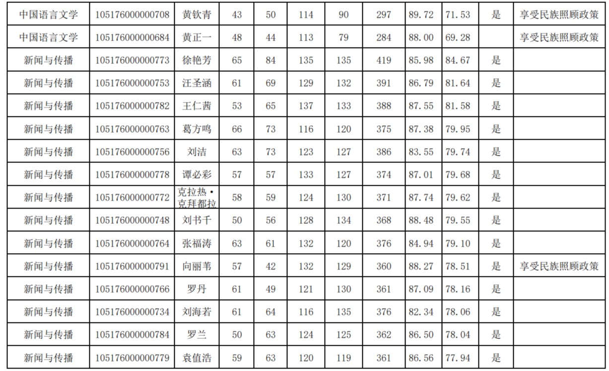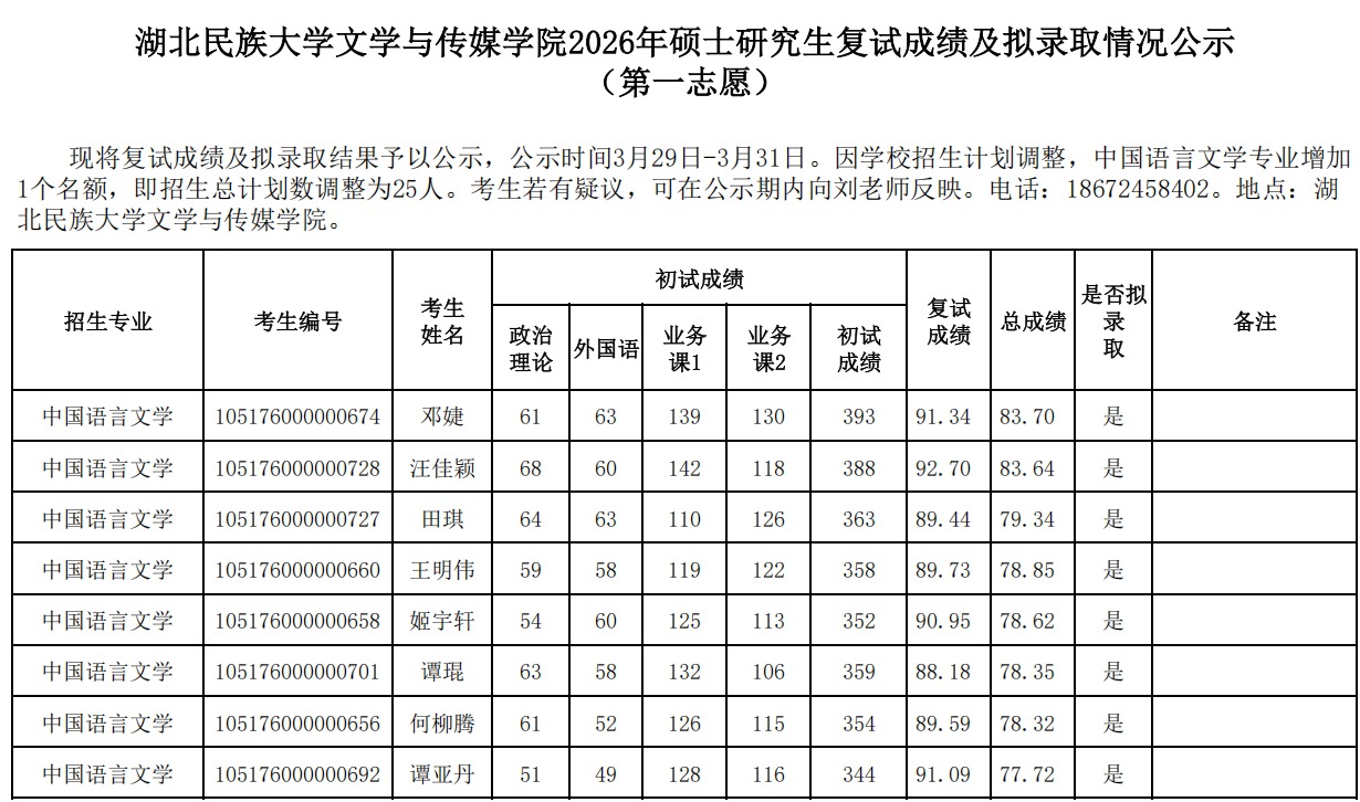 湖北民族大学文学与传媒学院2026年硕士研究生复试成绩及拟录取情况公示(第一志愿) 发布日期:2026-03-28 20:27:44    浏览量: 人次 打印   收藏
