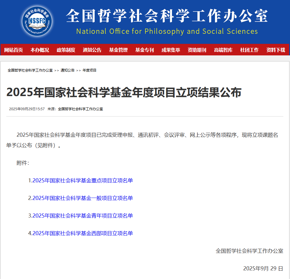 近日,全国哲学社会科学工作办公室公布了2025年度国家社科基金年度项目立项结果,我院江佳慧副教授申报的“数智技术赋能医患沟通语料库建设与应用研究”获西部项目立项。