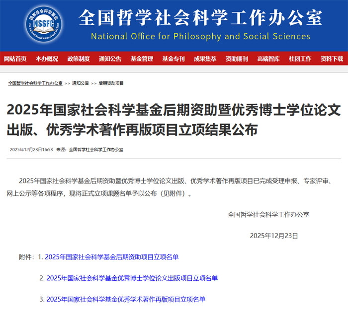经过全院师生的共同努力,2025年,全院获得国家社科基金项目3项,教育部人文社科研究一般项目1项,湖北省社科基金后期资助项目1项。