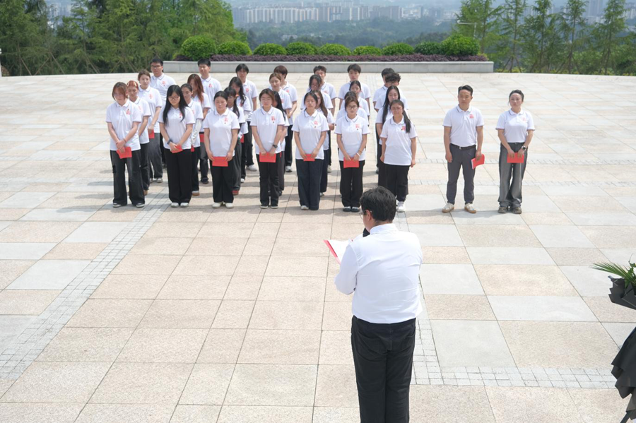 活动现场庄严肃穆,松柏苍翠环绕。全体团员统一着装、佩戴团徽,以崇敬之心开展缅怀仪式。团旗庄严入场,团员们面向团旗高举右拳,重温入团誓词,铿锵誓言回荡陵园;齐唱《光荣啊,中国共青团》,在激昂旋律中凝聚青春力量。团员代表缓步上前,向烈士敬献花篮,全体人员鞠躬默哀,深切缅怀何功伟烈士为革命事业英勇献身的崇高精神。