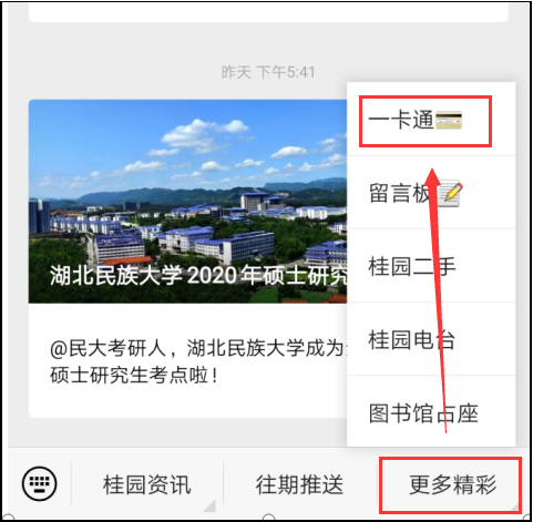2、 手机端圈存方法: 扫描以下二维码关注 “湖北民族大学”微信公众号,关注成功后进入公众号,点击右下角“更多精彩→ 一卡通→银行圈存”即可使用校园卡银行圈存功能。