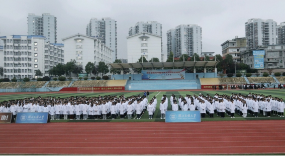 本网讯 (记者 贺露莹/文 杨格/摄)为深化爱国主义教育,强化医学生的职业使命感与责任感,10月27日,湖北民族大学医学部于五环体育场举行“国旗下的民大青春”特别主题团日活动。本次活动以“以仁爱思想铸医学青春底色”为主题,医学部新生统一身着医师服,佩戴团徽参加。
