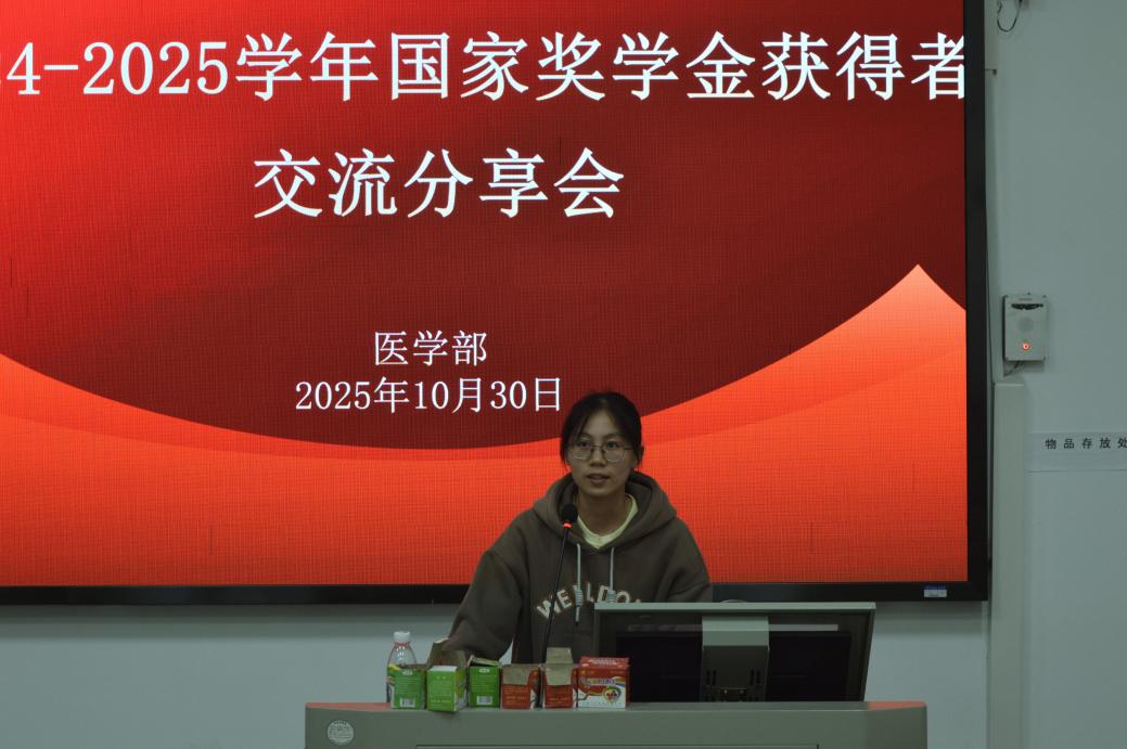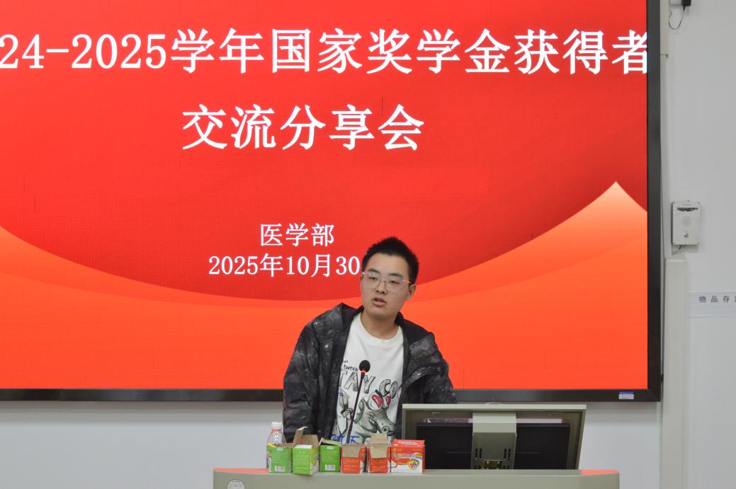 本网讯 (记者 许鑫洁/文 雷逸夫/摄)10月30日,湖北民族大学医学部于8304教室举办2024-2025学年国家奖学金获得者交流分享会。艾刚宇、陈乙华和肖棋丹三位同学受邀作为国奖获得者分享经验。