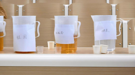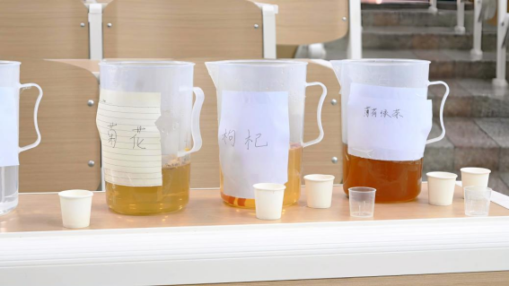 现场预备了薄荷绿茶、益母草当归、桂圆等多种茶基底,同学们可自由品尝,并依据个人喜好,动手搭配,创作自己的“专属茶饮”。